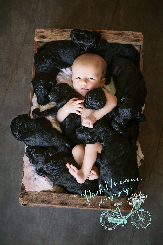 Após alguns dias, Kami chamou a fotógrafa do Park Avenue, Teresa Raczynski, para registrar um ensaio fotográfico super emocionante no estilo Newborn, com o bebê de Kami e os 9 filhotes de Délia juntos.