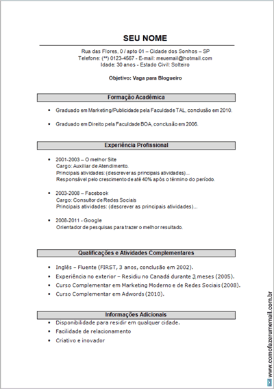 Agrupe as informações do seu curriculum vitae em blocos como Formação Acadêmica, Experiência Profissional, Atividades e Cursos Complementares.